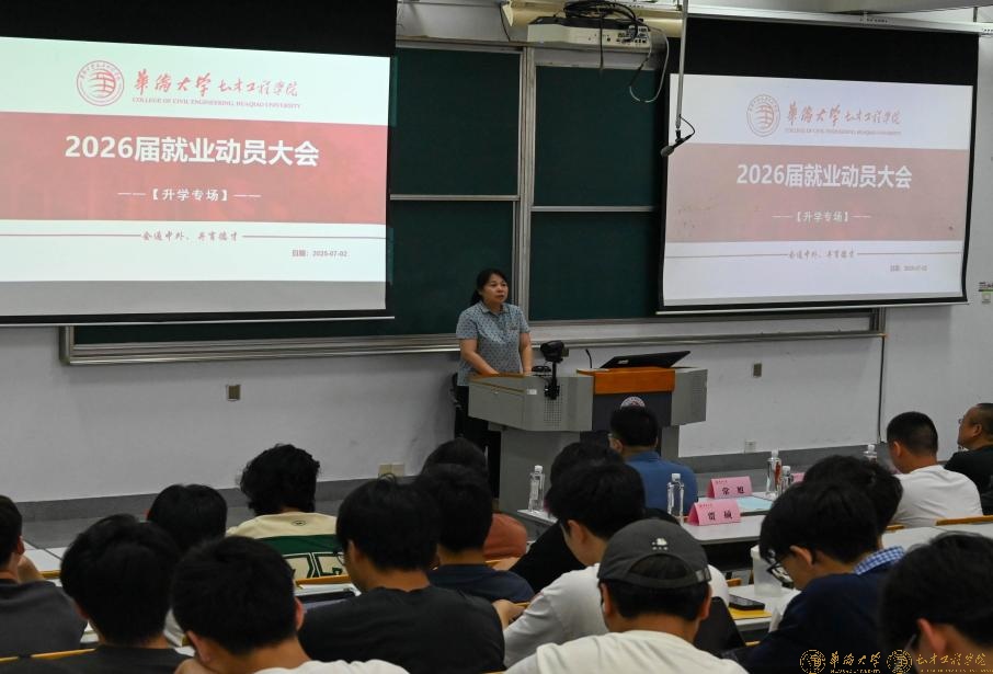 7 月 2 日,必赢76net线路官网 2026 届毕业生就业动员会在 D5 - 103、D5 - 203 教室分别举行。本次动员会创新形式,依据学生发展意向,首次开设 “升学”“就业” 专场,并邀请新东方名师王江涛、沛亚人力副总李健开展大思政课之 “砼启未来” 生涯规划讲座,同时聘任其为学院就业实践导师,为毕业生规划发展方向提供有力支持。